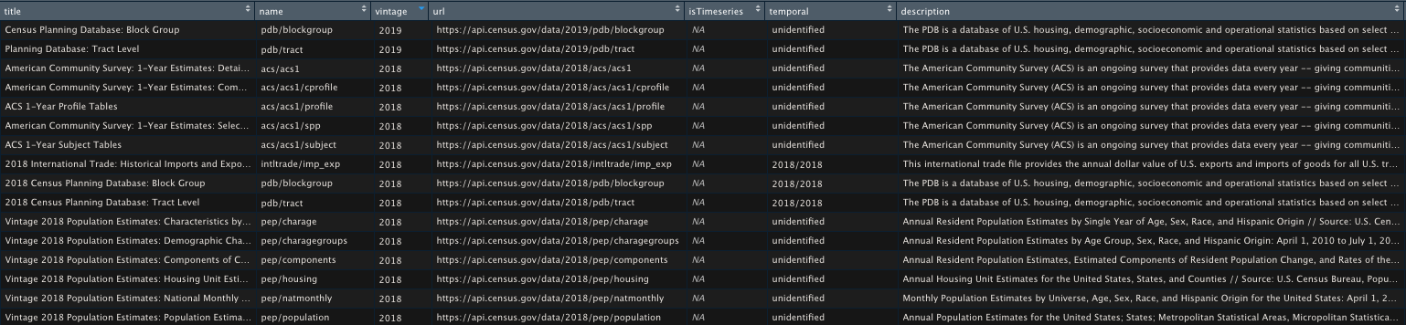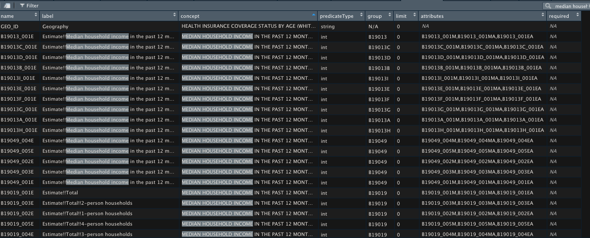 name - the name of the Census data set, like “acs5” or “timeseries/bds/firms”vintage - the year of the data setvars - one or more variables to accessregion - the geography level of data, like county or tracts or stateYou can use listCensusMetadata() to see what tables might be available from the ACS Census survey.