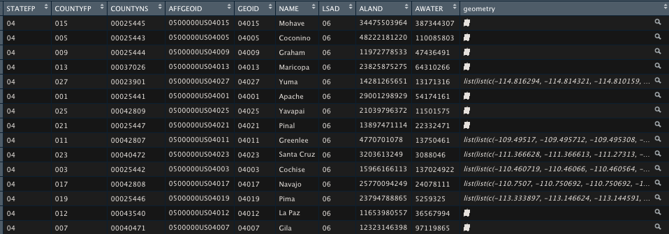 state="AZ", geometry=T)## Simple feature collection with 6 features and 5 fields