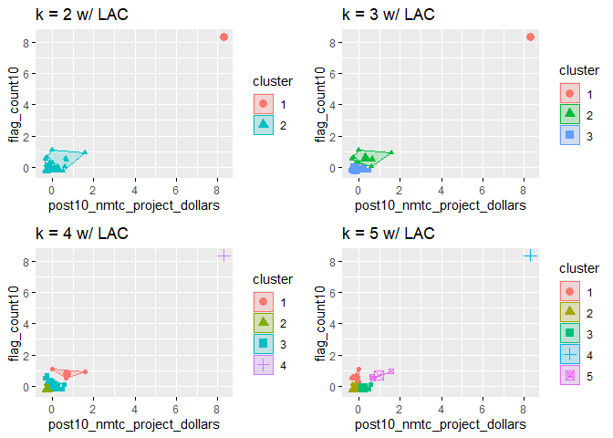 In every iteration of k = n, LAC comprises its own cluster, a good sign like with the NMTC data. What’s unique about the LIHTC data is that, at k = 4 and k = 5, the model clusters the other outlier independently as well. Let’s remove LAC, then add 1 to that elbow plot’s number to add LAC back in. As stated before, this is not valid according to the original elbow plot, but technically, the model is already overfitted because k-means is not the ideal clustering method for the Pacific Division when including LAC. We’ll leave the other outlier in the data because it belongs to a group in k = 2 and k = 3.