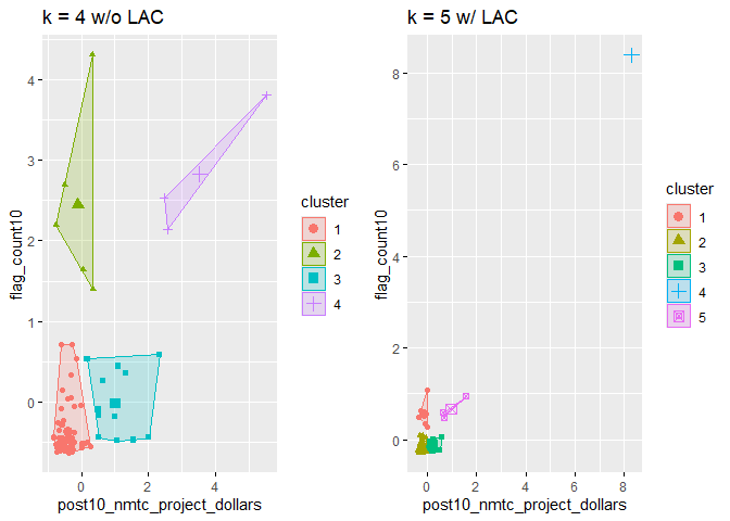Like the NMTC clustering, LAC degrades the visibility of the centroids in the bottom left and impacts the usability of the elbow plot. If we accept this elbow plot, it would mean LAC is by itself and the rest of the 27 counties in the Pacific Division are in a group.