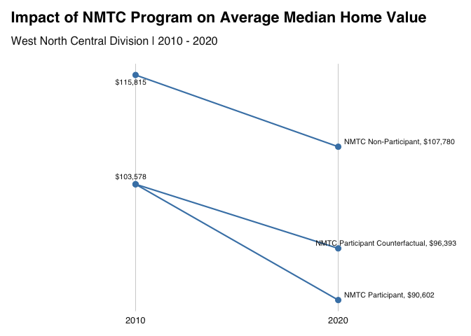 The home-value slopegraph reveals that participant tracts’ median home values rose from $103,578 in 2010 to $90,602 in 2020 (inflation-adjusted), compared with 115,815 to 107,780 in non-participant tracts, suggesting smaller gains in NMTC areas over the decade.