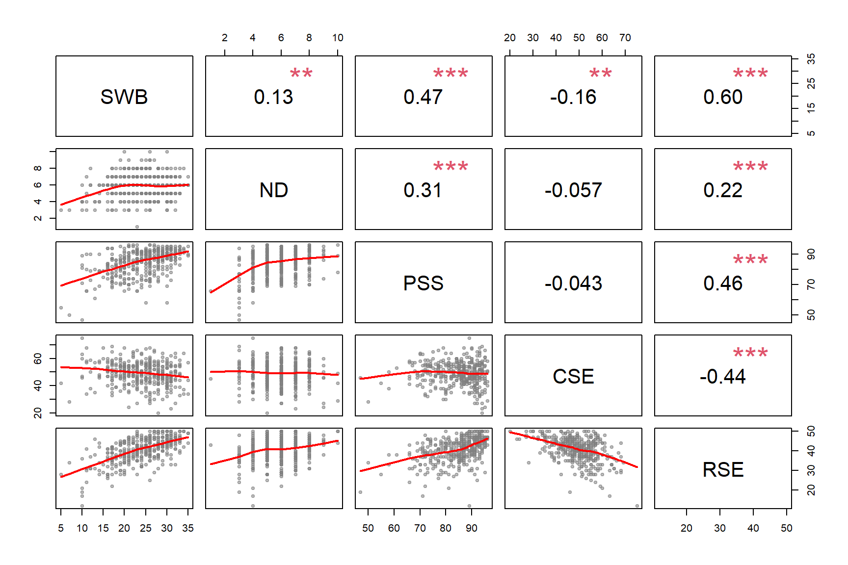 To examine this we will regress SWB onto RSE, SWB onto CSE.