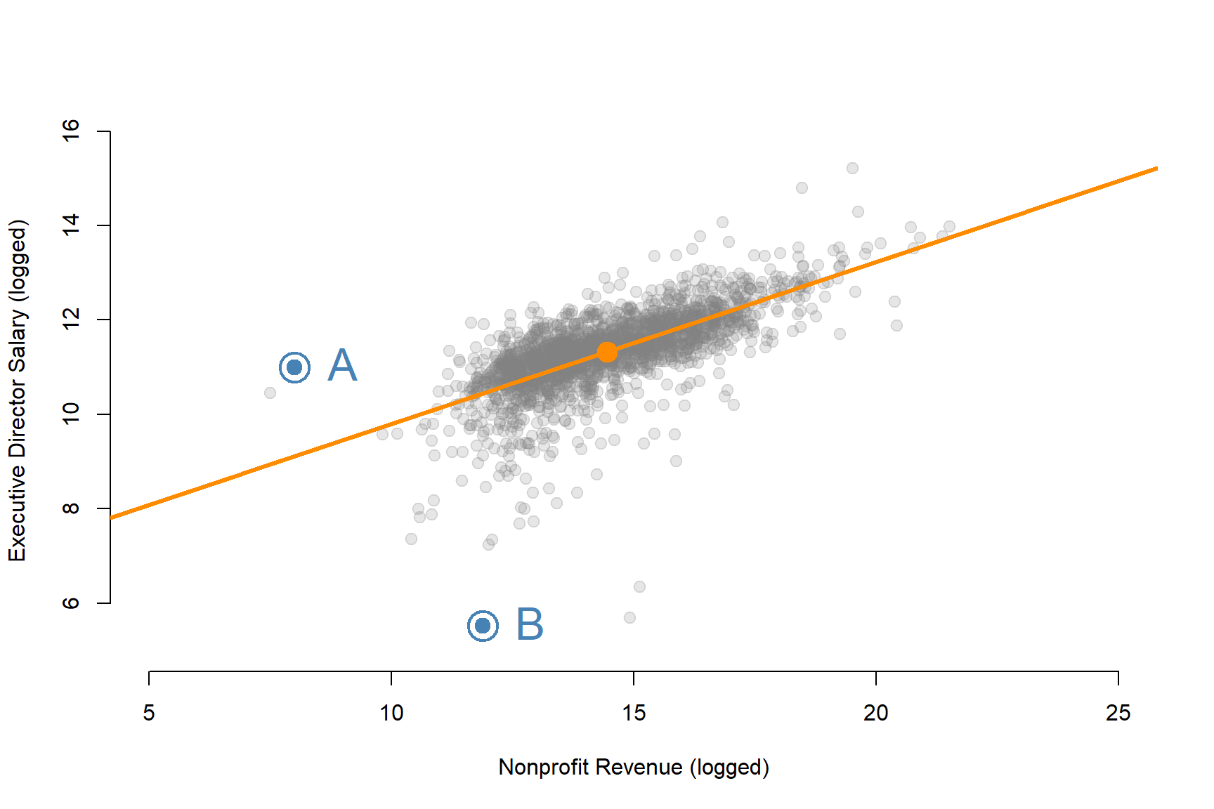 points( mean(log(d2$REVENUE)), mean(log(d2$SALARY)), pch=19, col="darkorange", cex=2 )