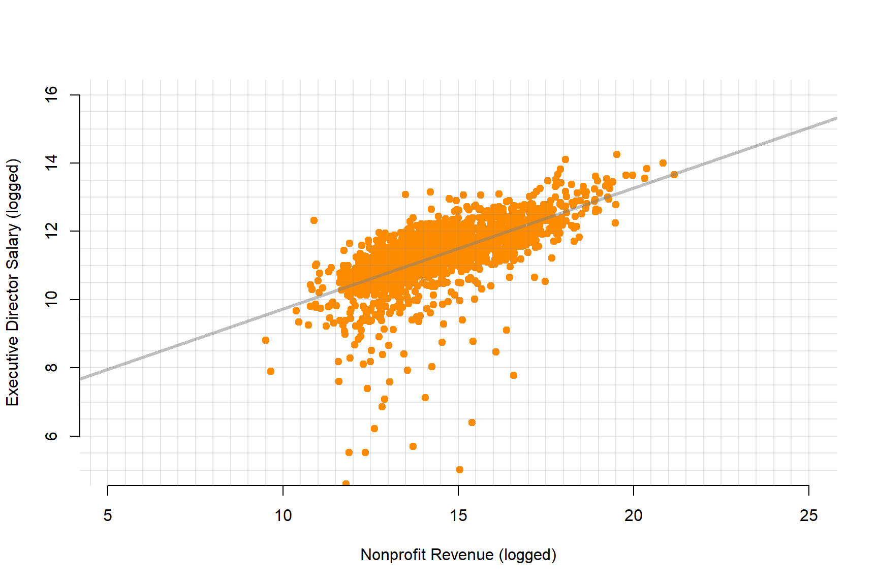 xlab="Nonprofit Revenue (logged)", ylab="Executive Director Salary (logged)",