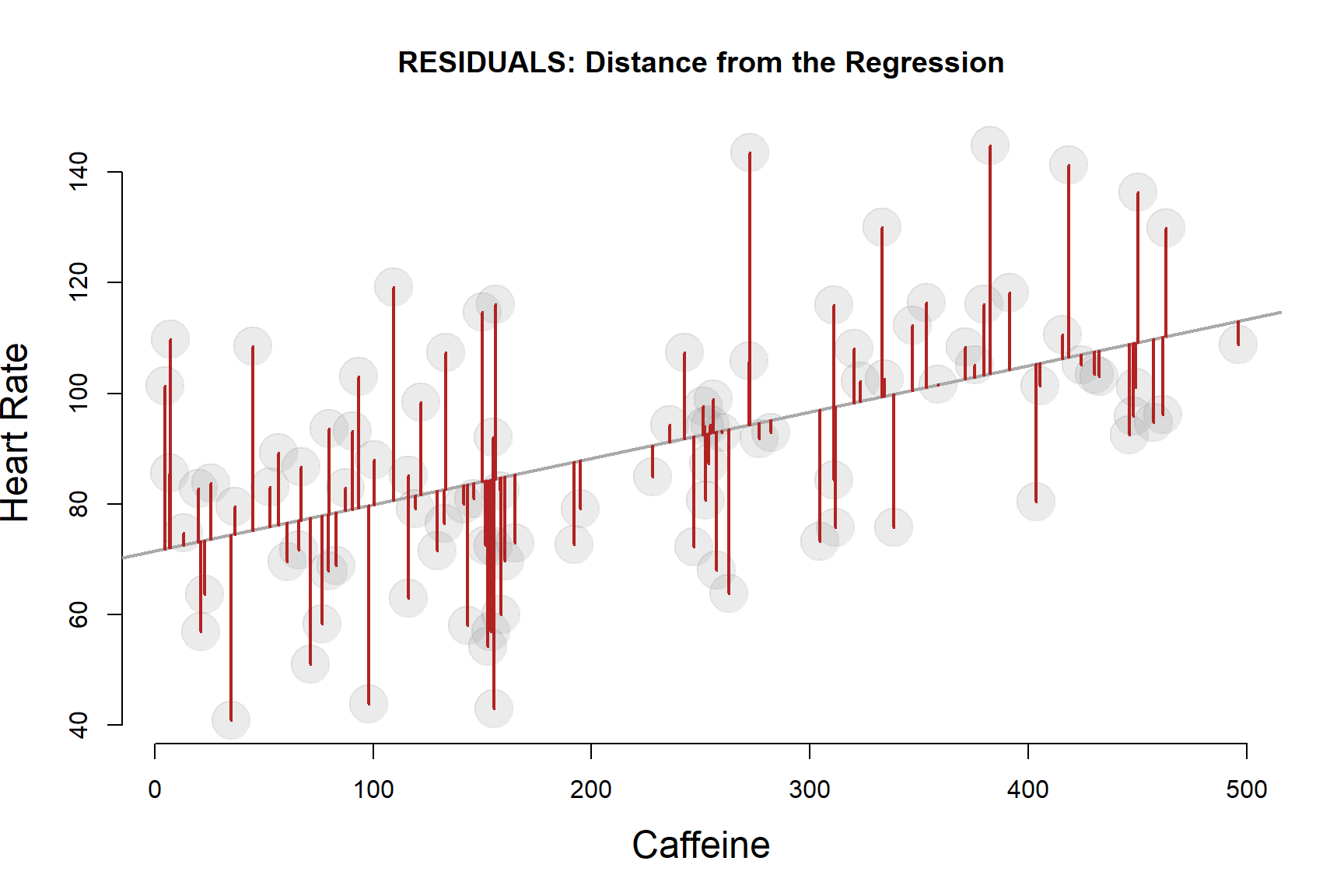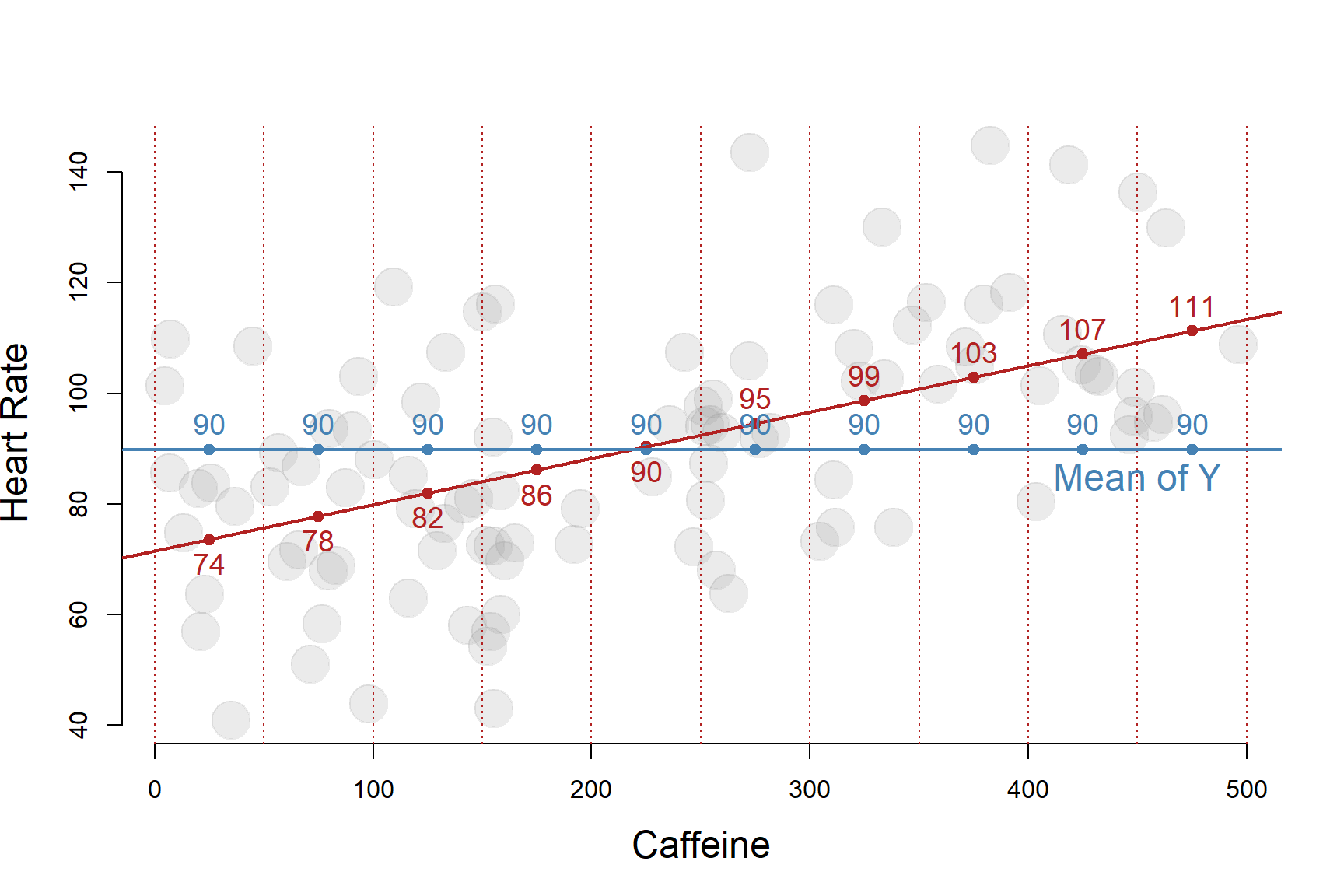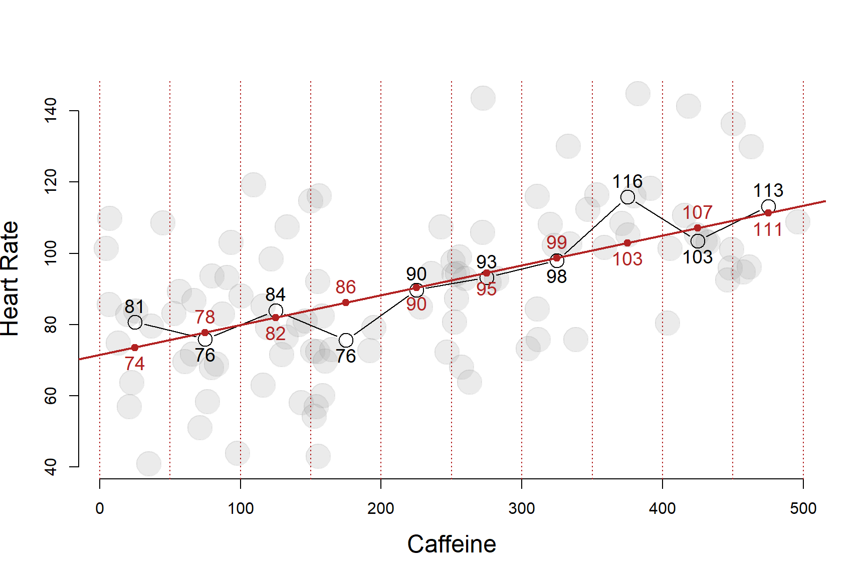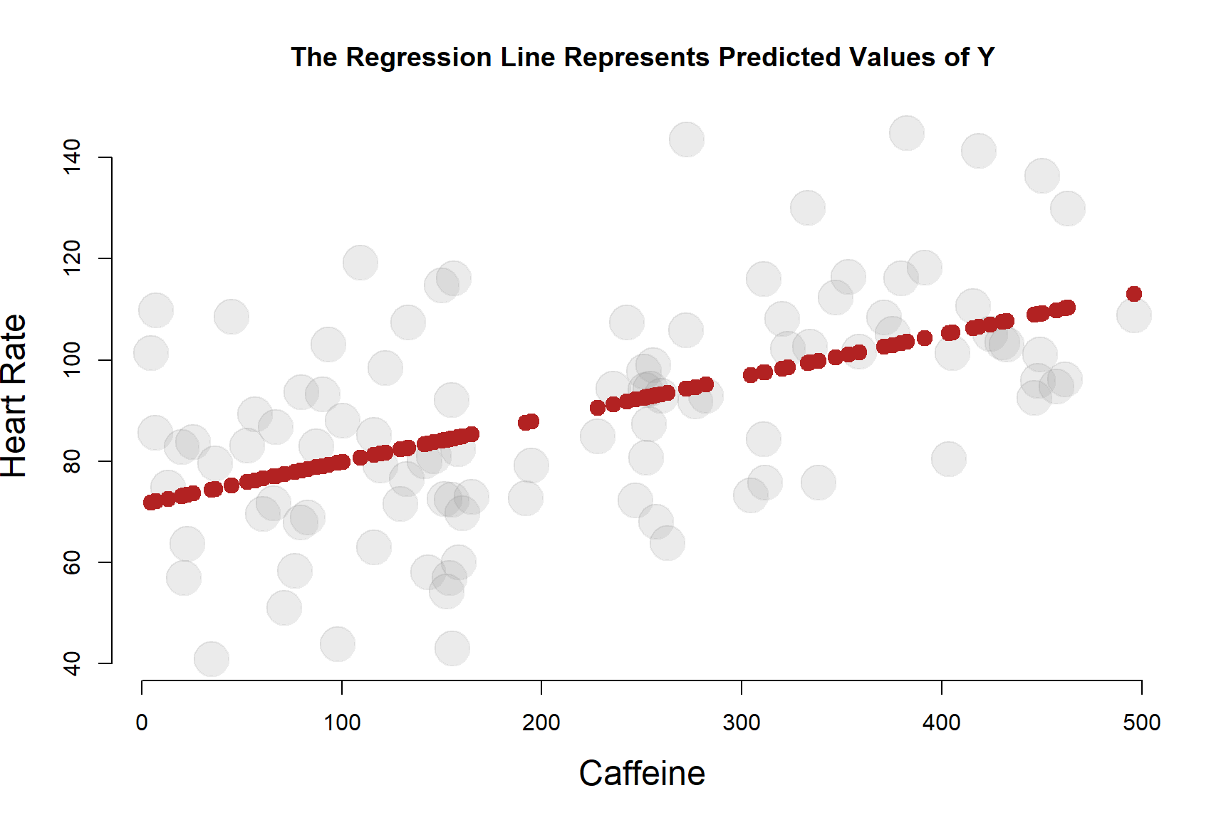 This does demonstrate an important point, however. The regression model is a conditional mean: it gives you the average heart rate of a subject conditional on how much caffeine they consumed.