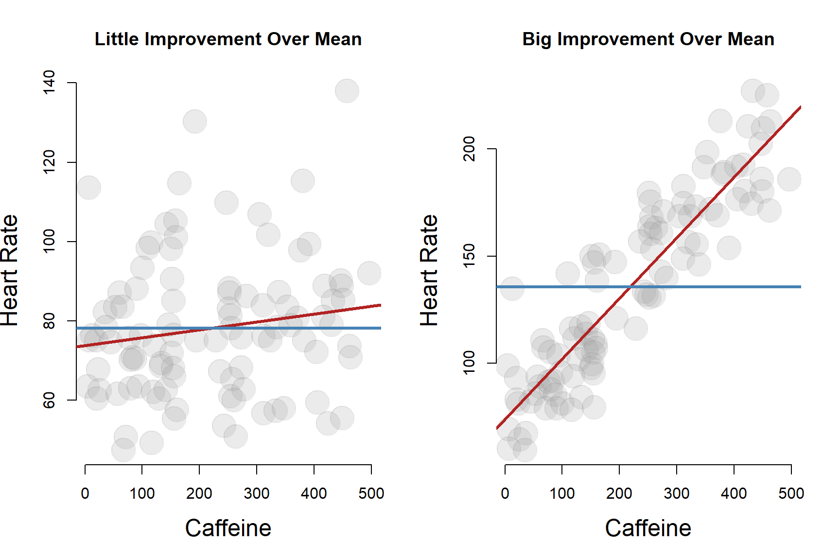 The strength of our regression model is to some extend a measure of how much our prediction of the true value of Y for an individual improves over simply using the population mean.