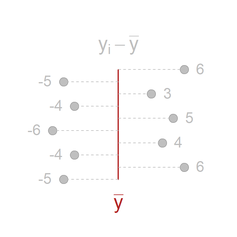 Since squaring terms ensures they are always positive, the quickest fix to this problem is to use the sum of squared deviations \((y_i - \bar{y})^2\).