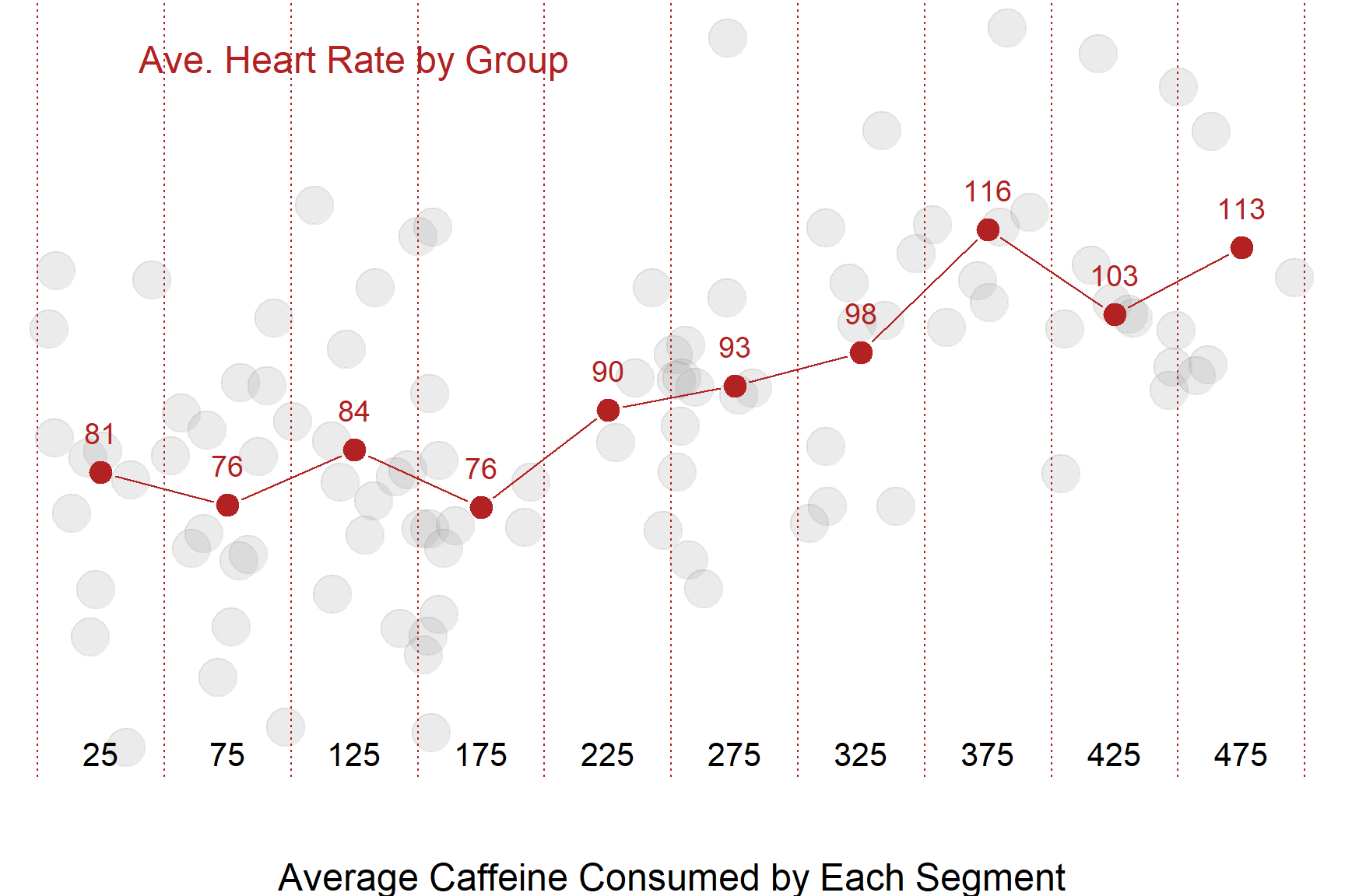 The regression model gives us a very clear estimate of the “average effect” of one mg of caffeine on heart rate.
