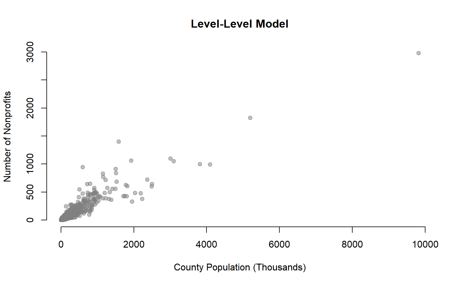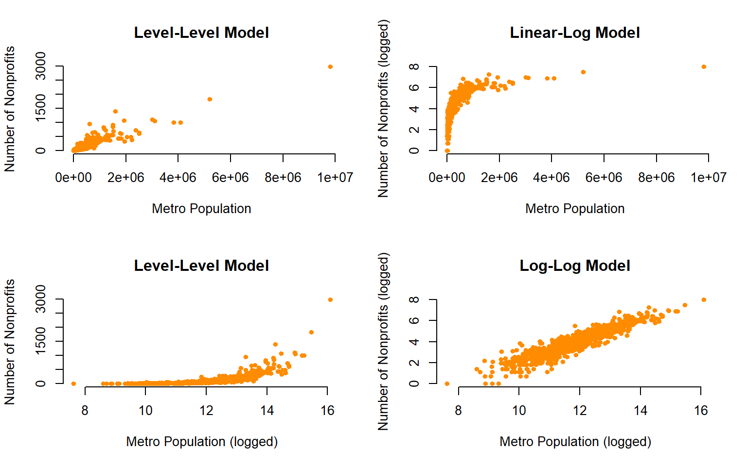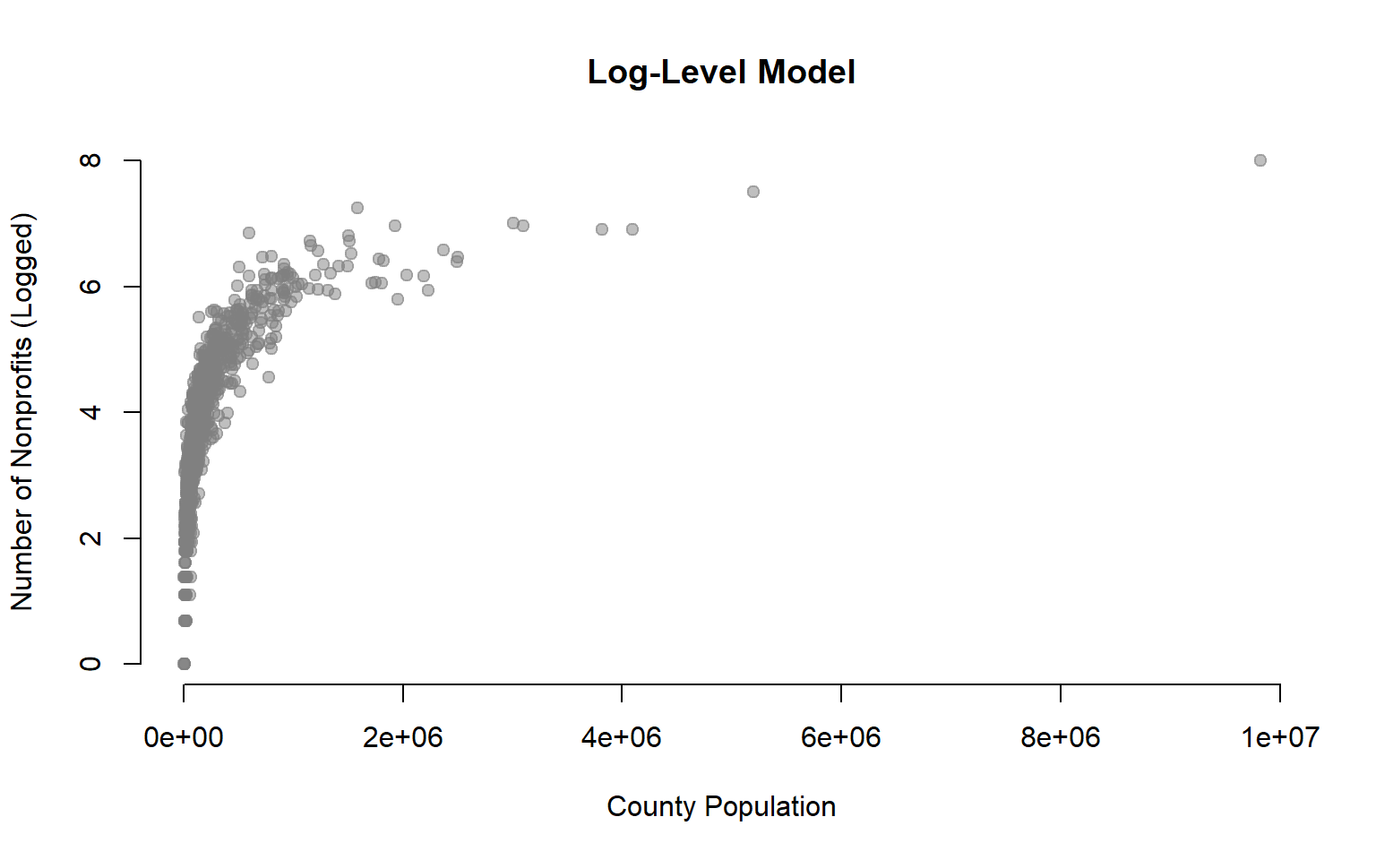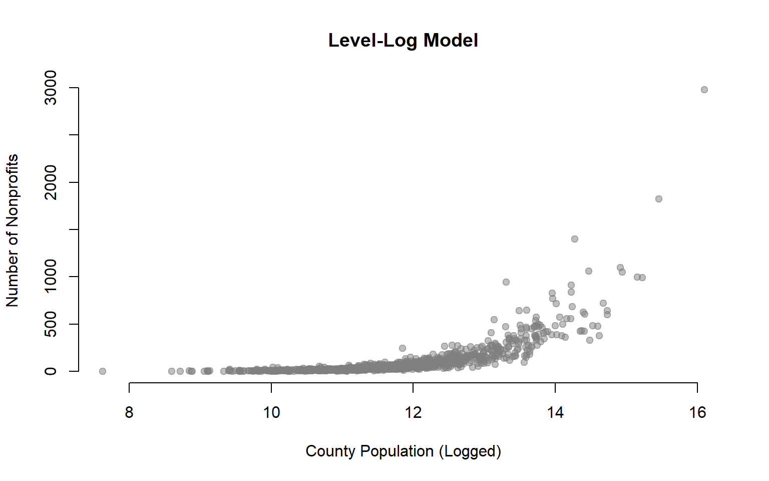xlab="County Population (Logged)", ylab="Number of Nonprofits",