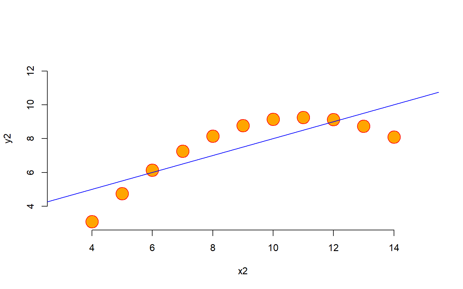 plot( y2 ~ x2, data=anscombe,