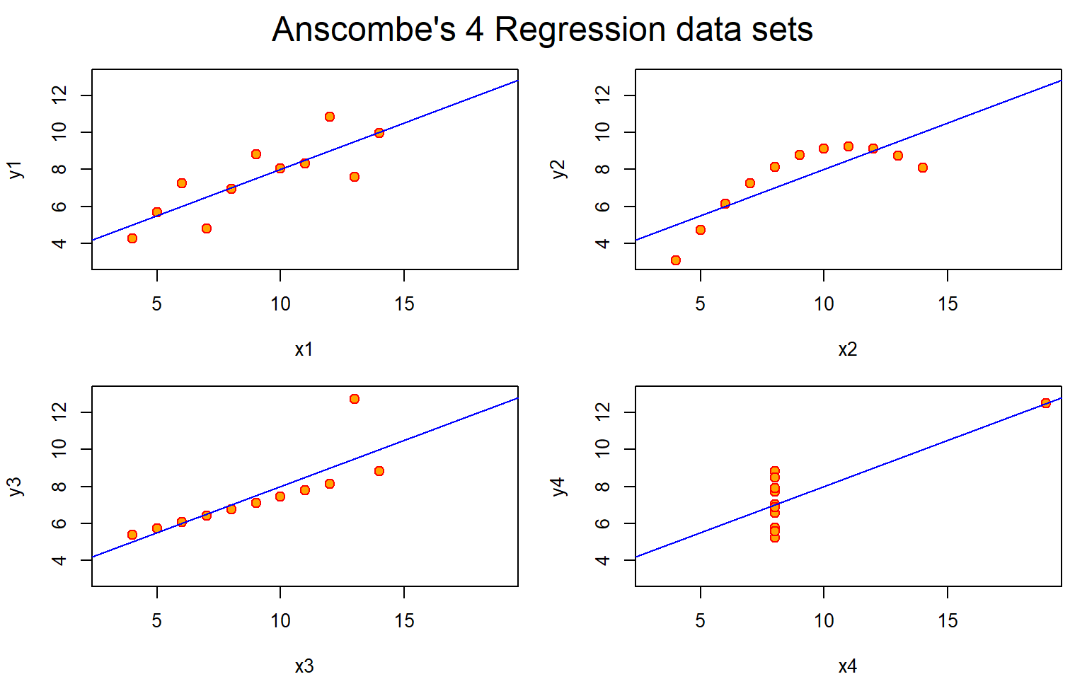 mtext("Anscombe's 4 Regression data sets", outer = TRUE, cex = 1.5)