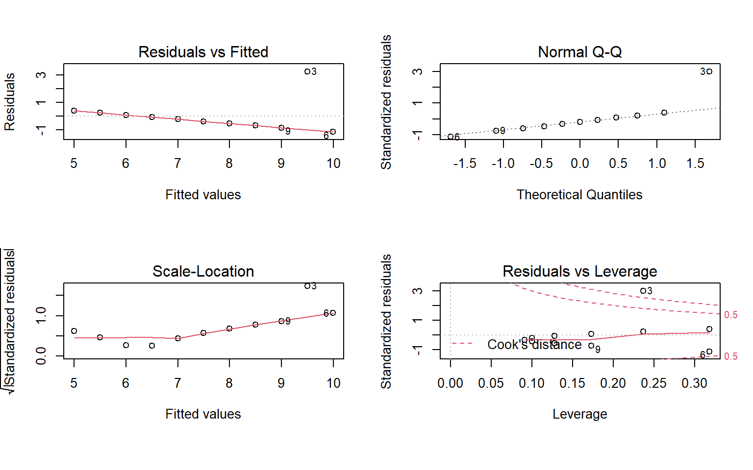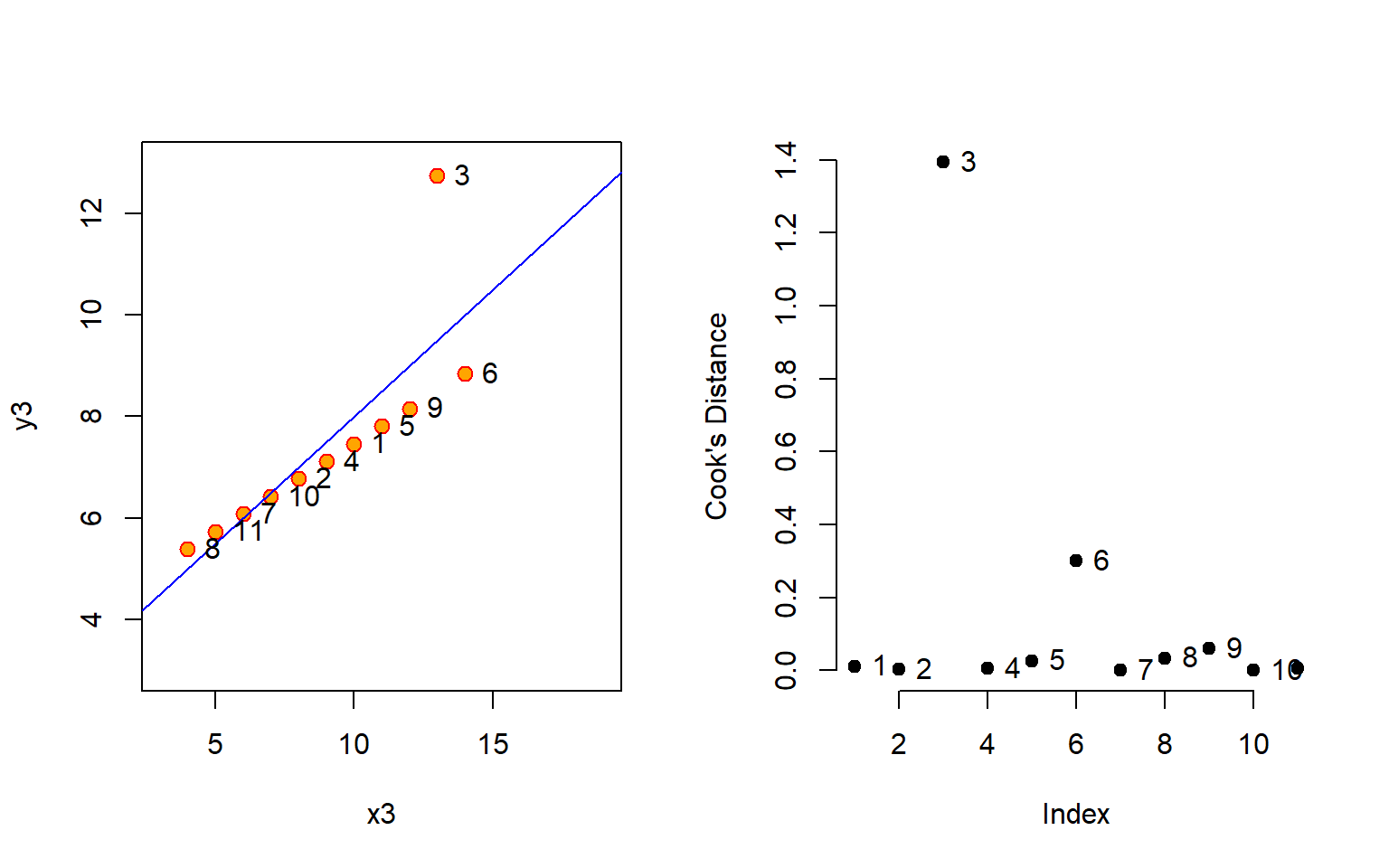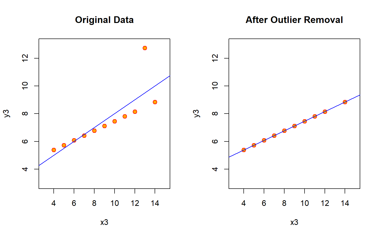 m3 <- lm( y3 ~ x3, data=anscombe )