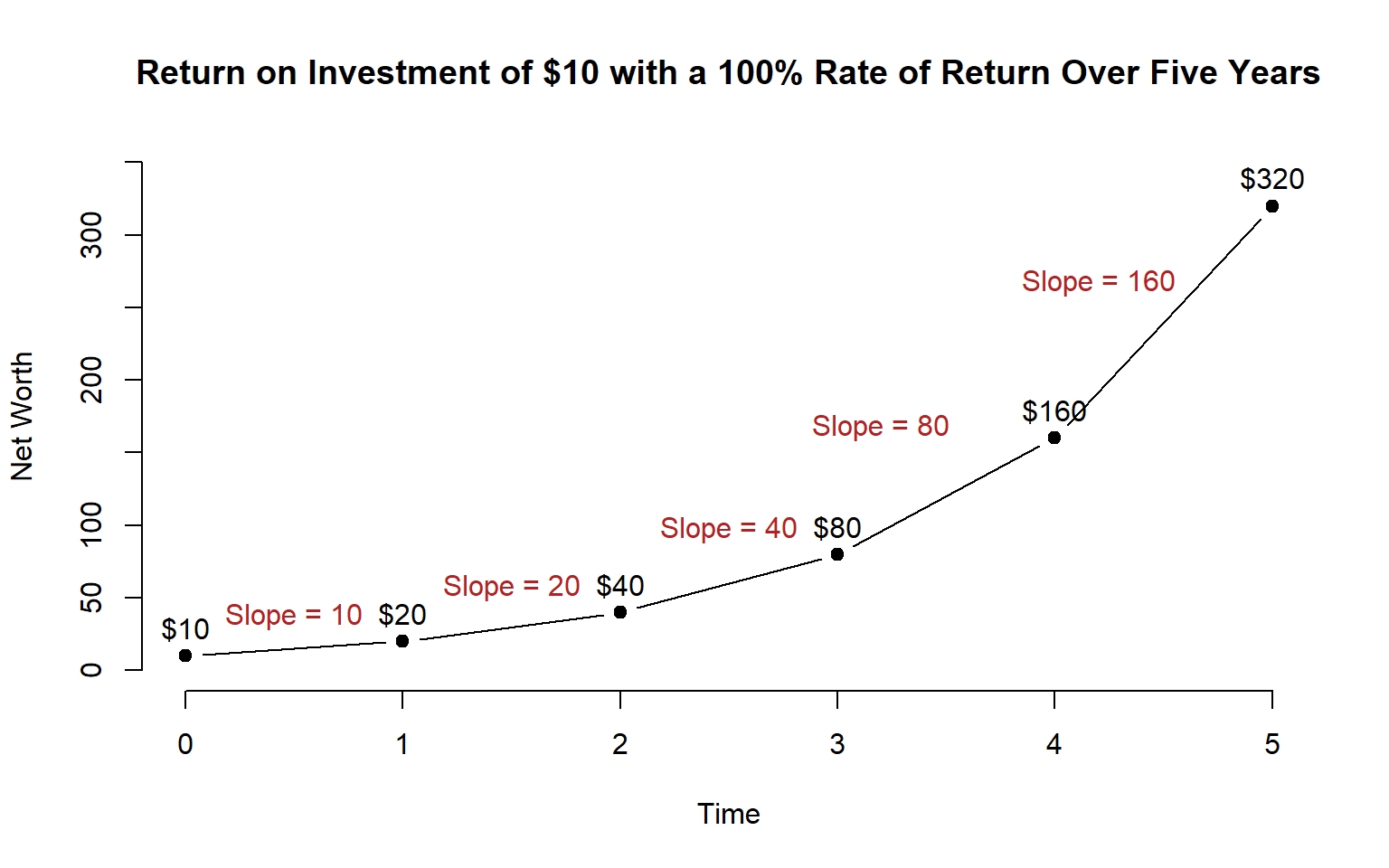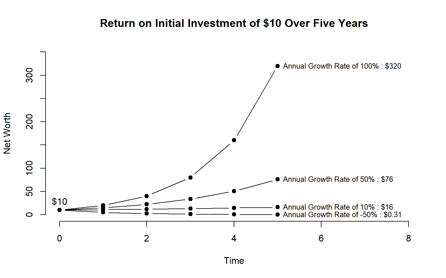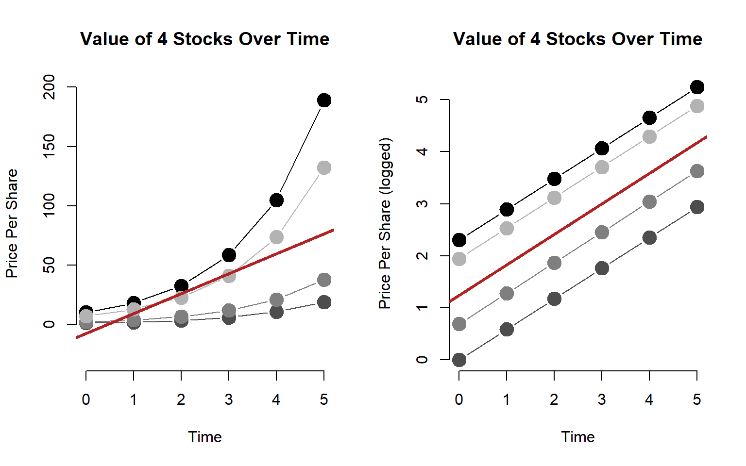 Our model of price growth is pretty accurate, though. Although the stocks have different initial values, they all grow at similar rates. If we are trying to model changes in a market over time we now have a good sense of the rate at which firms in a market are all growing.