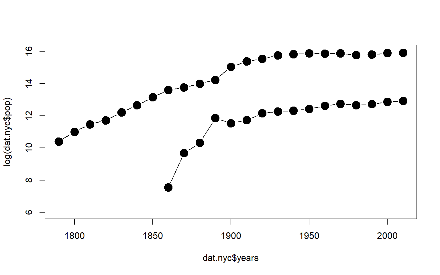 points( time, log(y1), type="b", pch=19, col="black", cex=2 )