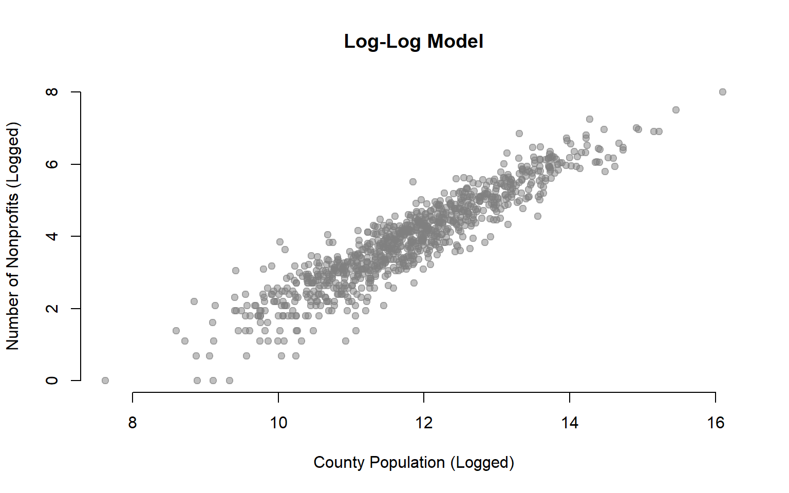 pch=19, col=gray(0.5,0.5), bty="n", main="Log-Log Model")