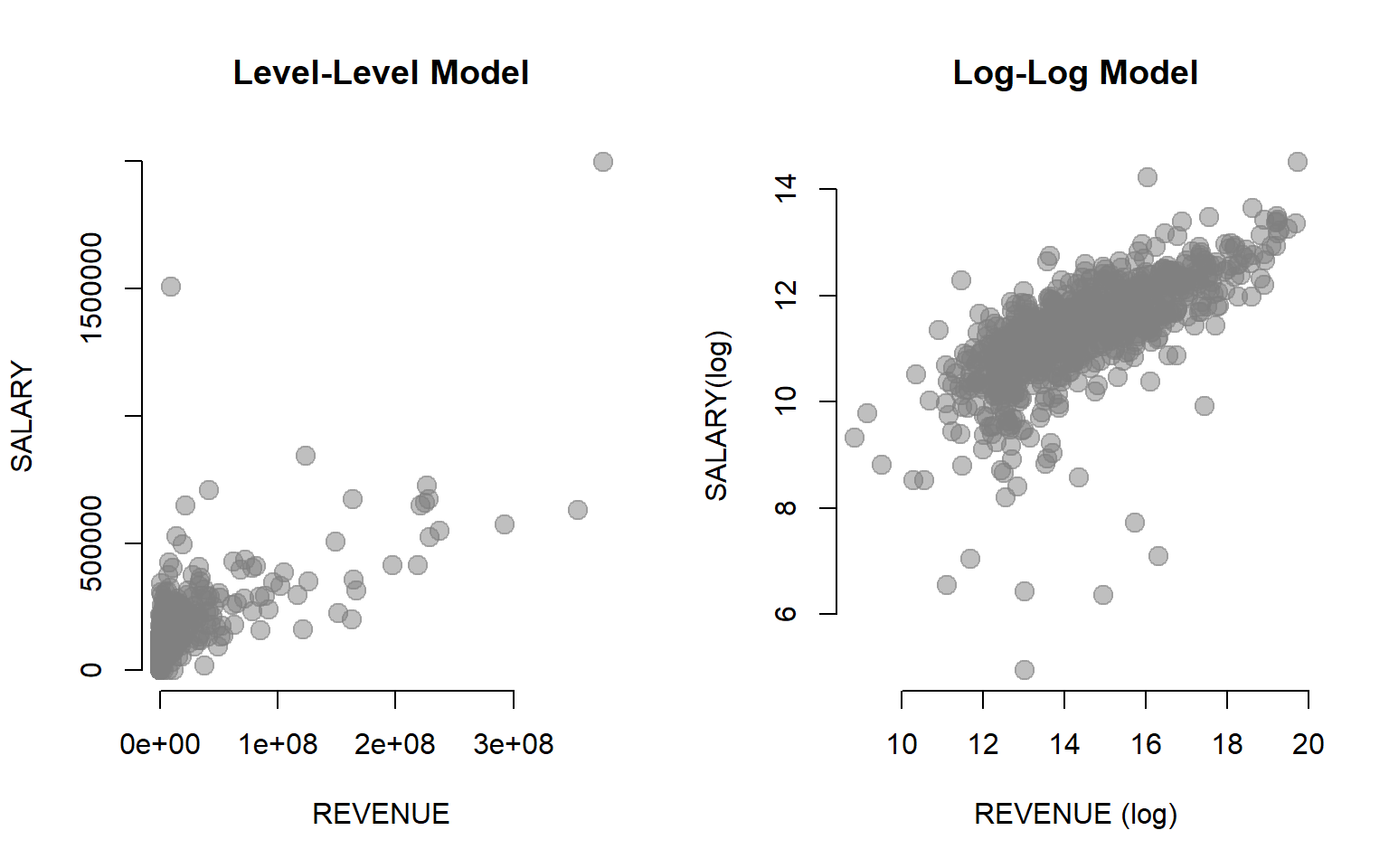 pch=19, col=gray(0.5,0.5), bty="n", main="Log-Level Model")