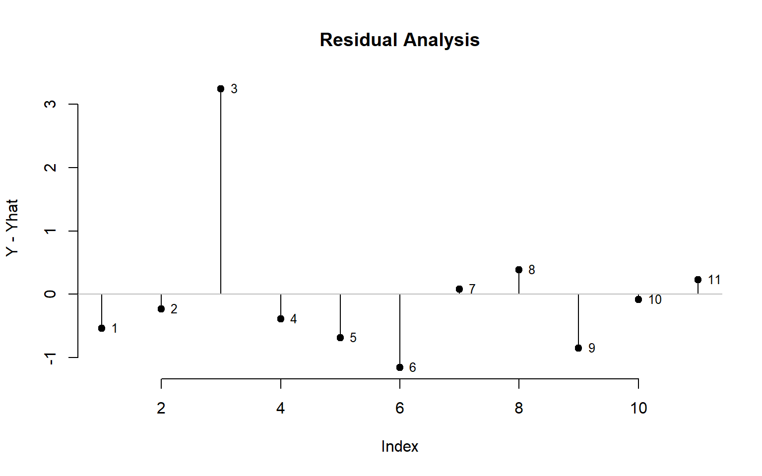 text( 1:11, m3$residuals, 1:11, pos=4, cex=0.8 )